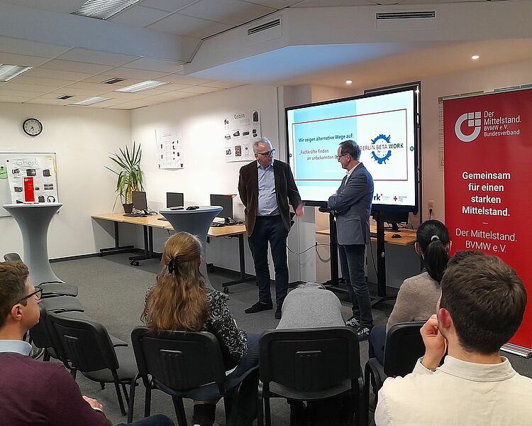 Am Donnerstag, 20. Februar 2025, richtete das Rotkreuz-Institut dort gemeinsam mit dem Bundesverband mittelständische Wirtschaft (BVMW) eine Abendveranstaltung aus, die sich primär an Geschäftsführende und Personalverantwortliche aus dem Mittelstand richtete. Sie sind es, die zurzeit stark vom Fachkräftemangel betroffen sind. 15 von Ihnen hatten sich für die Veranstaltung vorab angemeldet – letztlich kamen sogar mehr Interessierte.