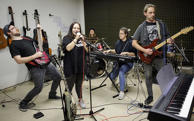 Wer musikalisch interessiert ist, kann sich bei uns instrumental weiterentwickeln oder sogar ein neues Instrument erlernen. Unser Proberaum hält laute - undschiefe - Töne aus. Band- und Songwriter-Projekte sind unsere musikalischen Highlights, die häufig im "Rocken" unserer Feste münden.